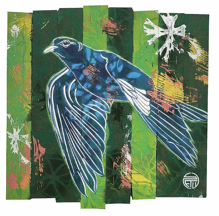 Stew | Liberté, 2024 | Pochoir et tampons acrylique sur bois | 43×43 cm