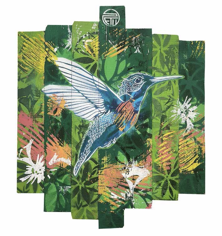 Stew | Un Batement d ailes, 2024 | Pochoir et tampons acrylique sur bois | 36×43 cm