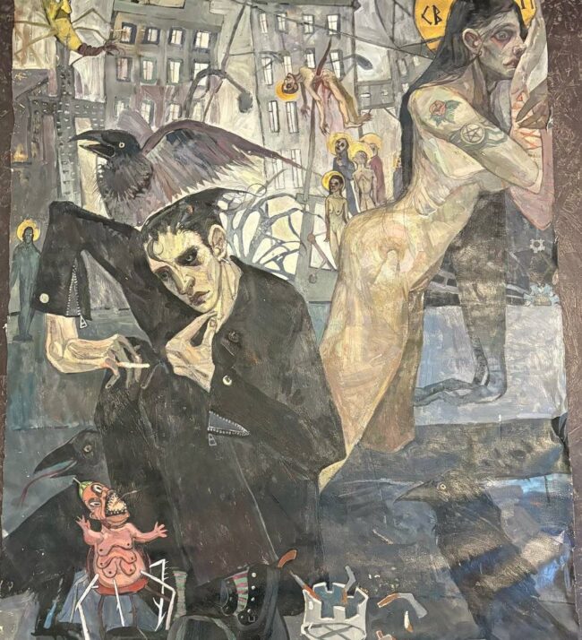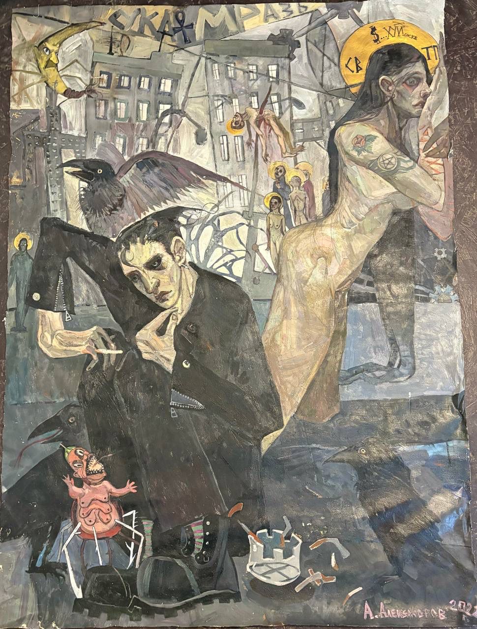 Oleksii Aleksandrov defines himself as an artist without nation, without style, without school. His works — stripped of frames, marked by fractures and pain — are nourished by the extreme metal music he listens to daily, by Soviet gulag literature (The Gulag Archipelago by Solzhenitsyn), and by visions of a collapsing world.