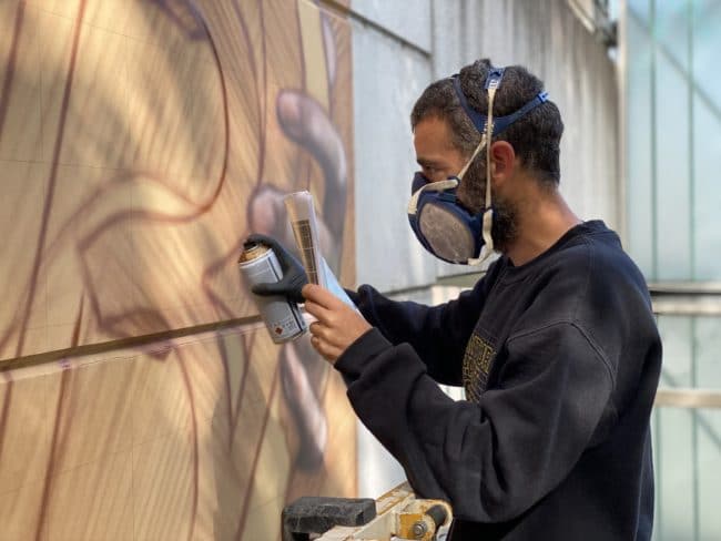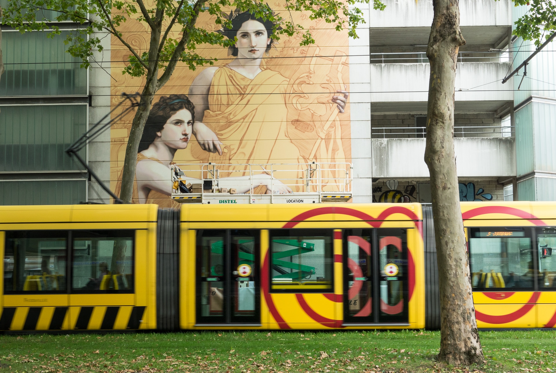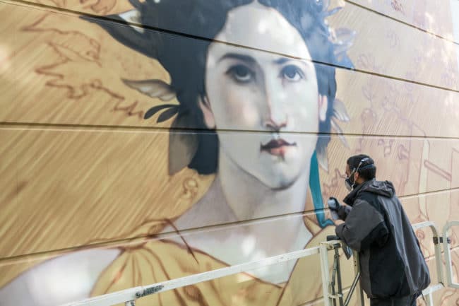 Réalisation de la galerie Orlinda. Voici la fresque de l’artiste italien Andrea Ravo Mattoni sur la façade du parking du Cinéma Kinépolis à Mulhouse. Fresque librement inspirée du tableau l’art et litterature de l’artiste français du 19eme siècle William Bourguereau.